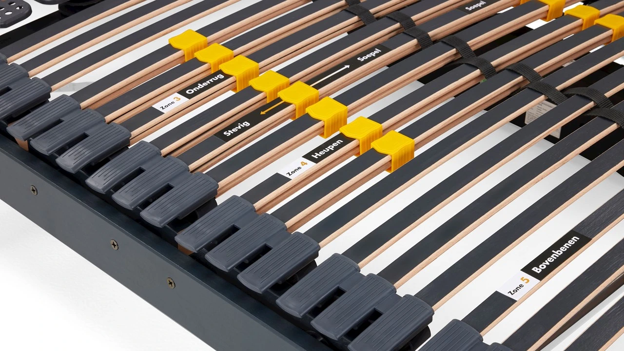 Met de Lattenbodem Bossflex 600 deluxe elektrisch verstelbaar draadloos haal je een goede lattenbodem in huis. De latten zijn gemaakt van solide beukenhout en zorgen voor een goede ondersteuning. Door een schuifmechanisme kun je heel eenvoudig extra veerkracht en ondersteuning creëren bij je schouders en heupen. De extra kunststof schotels zorgen voor extra comfort bij de schouders. De bodem zorgt voor voldoende vering over het gehele ligoppervlakte en is eenvoudig elektrisch te verstellen.